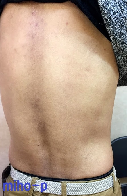 | 福島県 30代 男性 長期間、背中や腕の湿疹と痒みでステロイド軟膏を使用。 今年8月頃よりステロイド軟膏を使用しても湿疹が治らず、今までにないほどに症状が広範囲に広がる。 たまたま職場に当店のお客様がいらっしゃり、「美保薬局に行ってみたら。」と勧められご来店いただきました。 来店時使用していたお薬 ・スチブロン軟膏(ステロイド軟膏:5段階で上から2番目の強さ) ・リンデロンVG軟膏(ステロイド配合軟膏:5段階で上から3番目の強さ) ・アレロック内服(アレルギー性疾患治療) | |