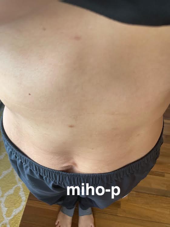 ![]() | 上2つの写真に比べて、炎症(肌の赤み)は大分落ち着きました。この段階で 炎症をとる薬5:カサつきをとる薬5 の配分にします。特にお腹周りに色素沈着(炎症後の黒ずみ)が見えますので、カサつきをとりながら、色素沈着にも対応できるお薬を選びます。 |