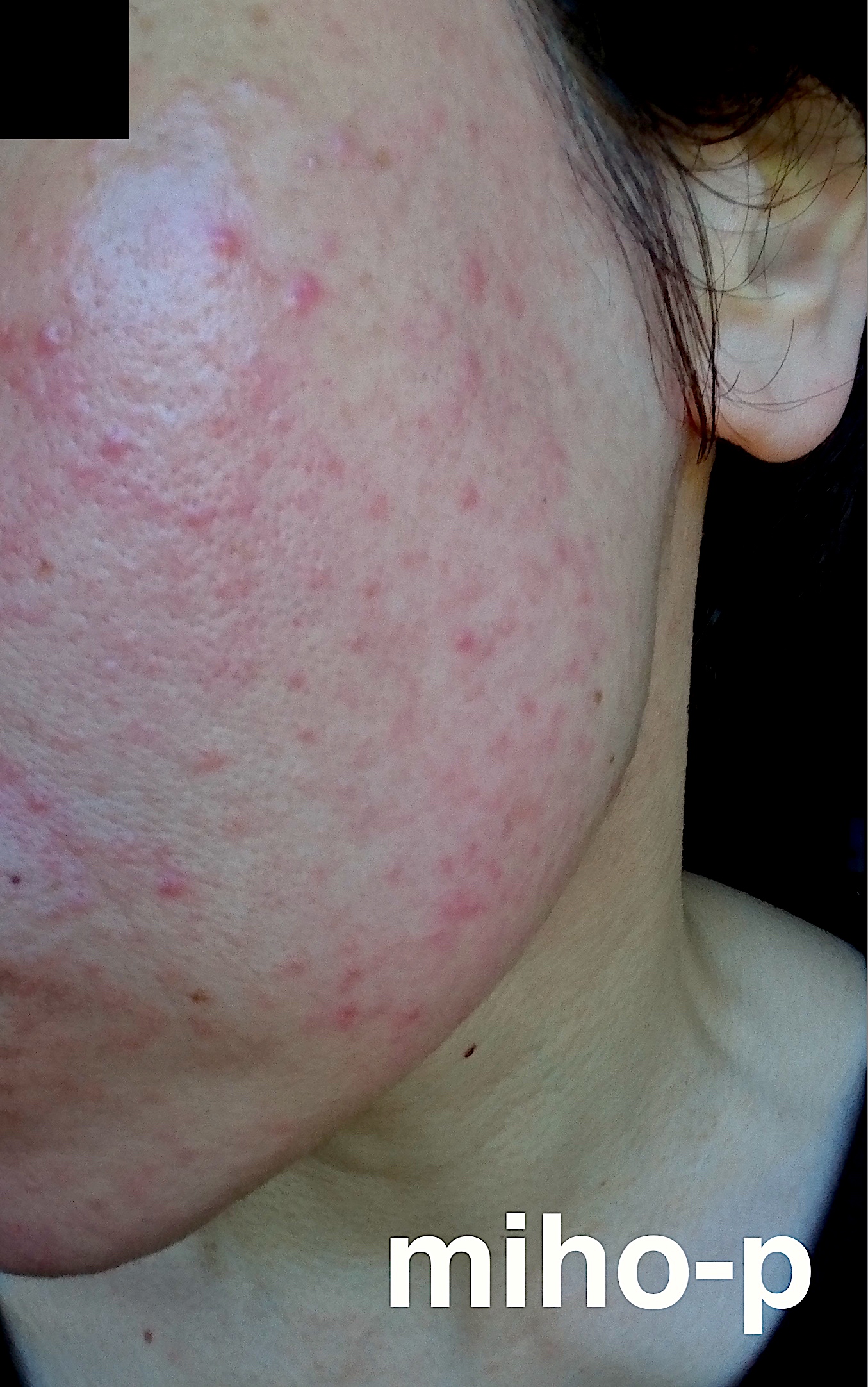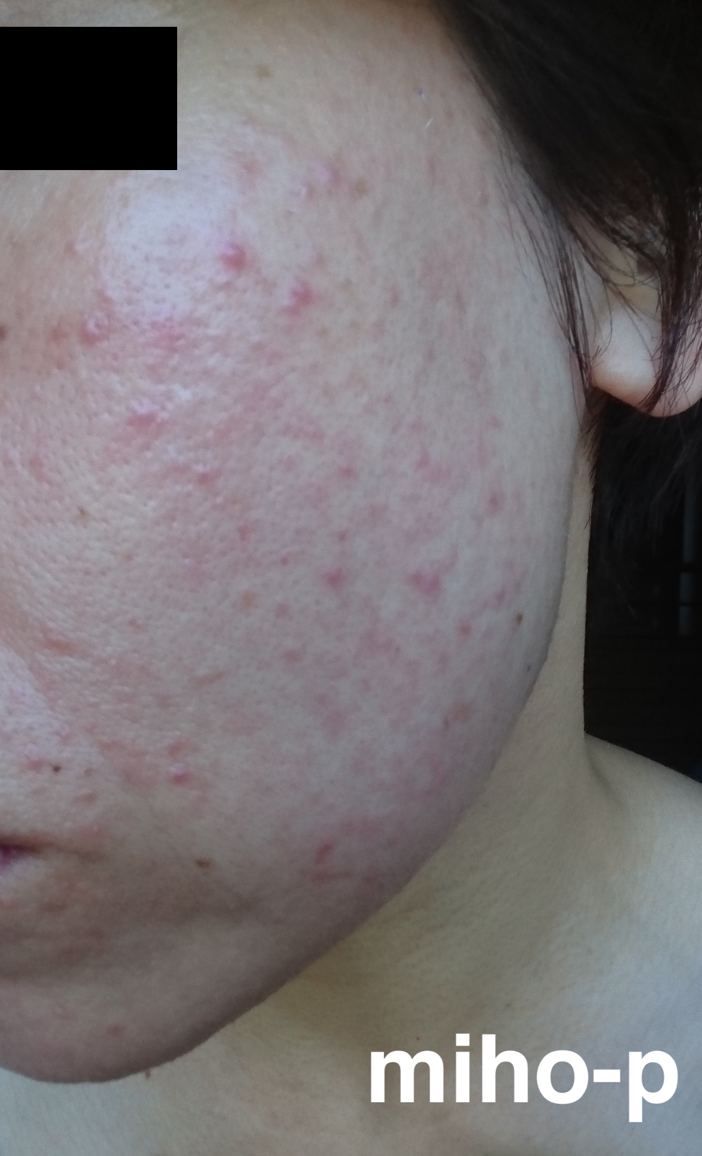 | | 左の写真は化粧をしてしまっていますが、以前までは化粧をしても赤みが目立ち、また化粧も浮いてしまっていましたが、炎症が落ち着き化粧も浮かなくなりました。 生活習慣の注意としては ・コーヒー、アルコールは控える ・香辛料等の刺激物は控える ・寒暖の差で肌を刺激しない ・ストレスは避ける ・睡眠不足は避ける また炎症を抑えるためステロイド軟膏を長期連用して改善せずご来店になるお客様多いです。 「酒さ」へのステロイド連用は非常に危険です。14日以上の使用はご注意ください。 |